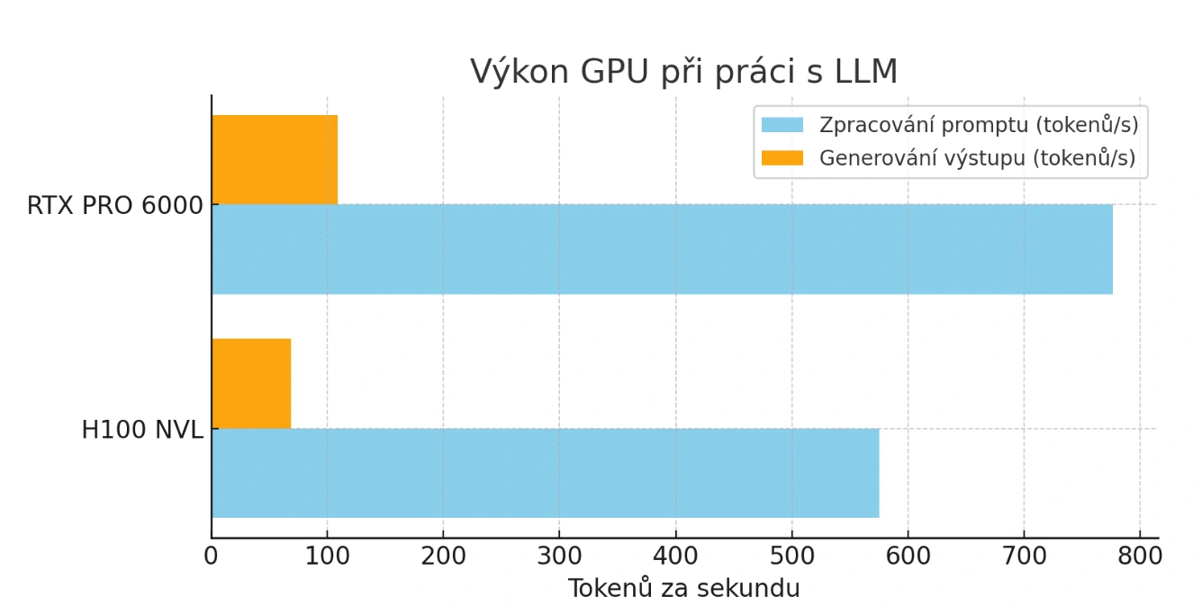 Z tabulky je jasné, že H100 má sice výhodu v efektivite a priepustnosti pamäte, ale RTX PRO 6000 víťazí v praktickosti – celý model zvládne v jedinom GPU bez nutnosti zložitej infraštruktúry.